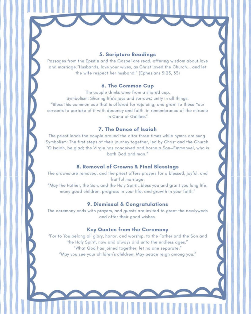 - Removal of crowns & final blessings: The priest lifts the crowns and prays for a pure, blessed marriage, invoking biblical couples as examples.